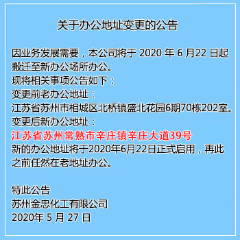 蘇州金忠化工有限公司成立于1995年元月,位于人杰地靈、山清水秀的蘇州市相城區。而生產工廠則位于國家級化工園區-蘇州常熟市新材料產業園區。 園區水、電、汽設備配套齊全。生產工廠占地面積70,000m2,擁有標準廠房50,000m2,2002年通過了ISO9001國際質量體系認證。